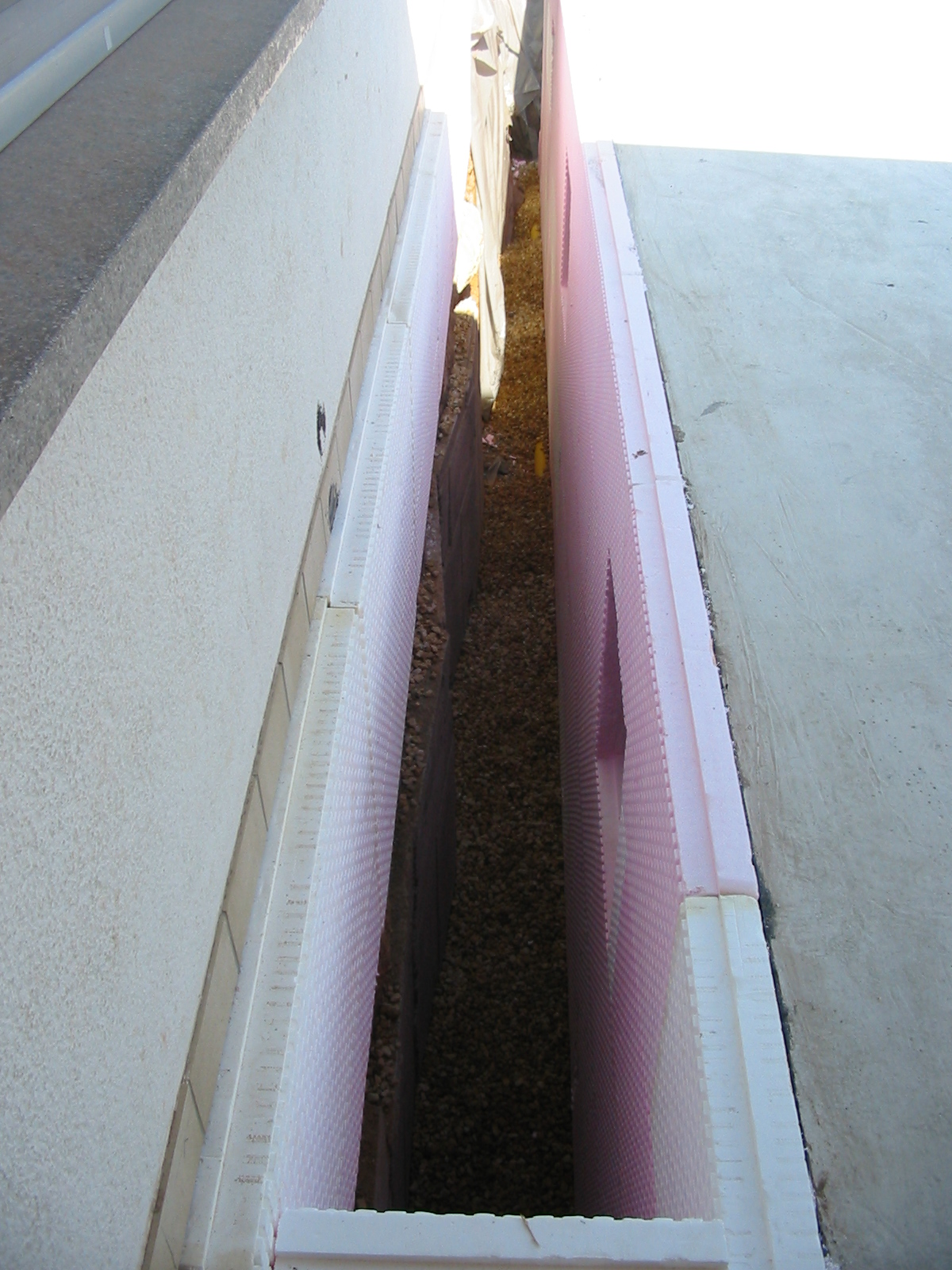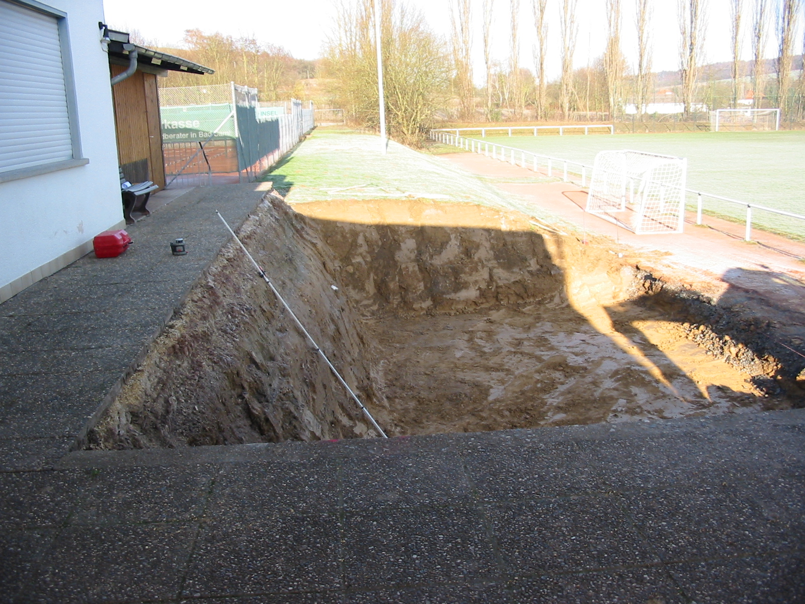 Anbringen der Lichtschächte im gefüllten Schacht zwischen Sportheim und Anbau.