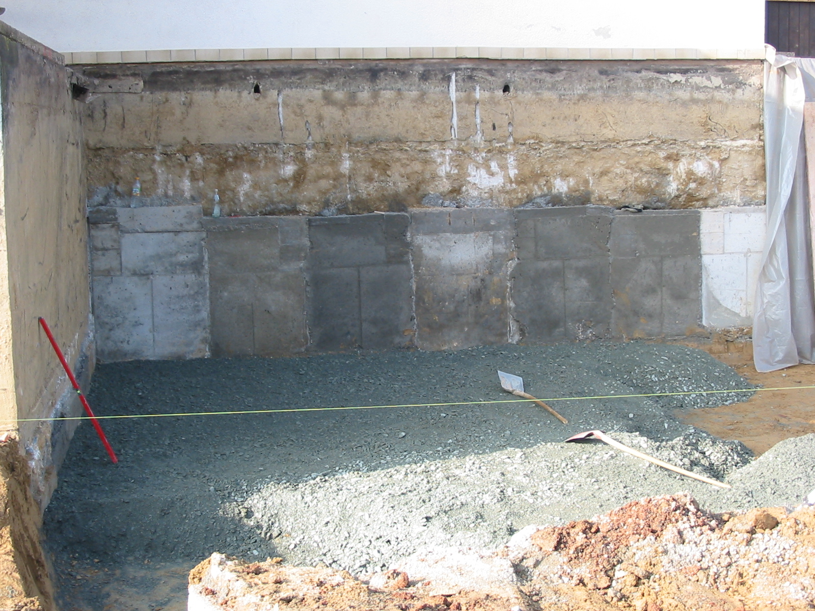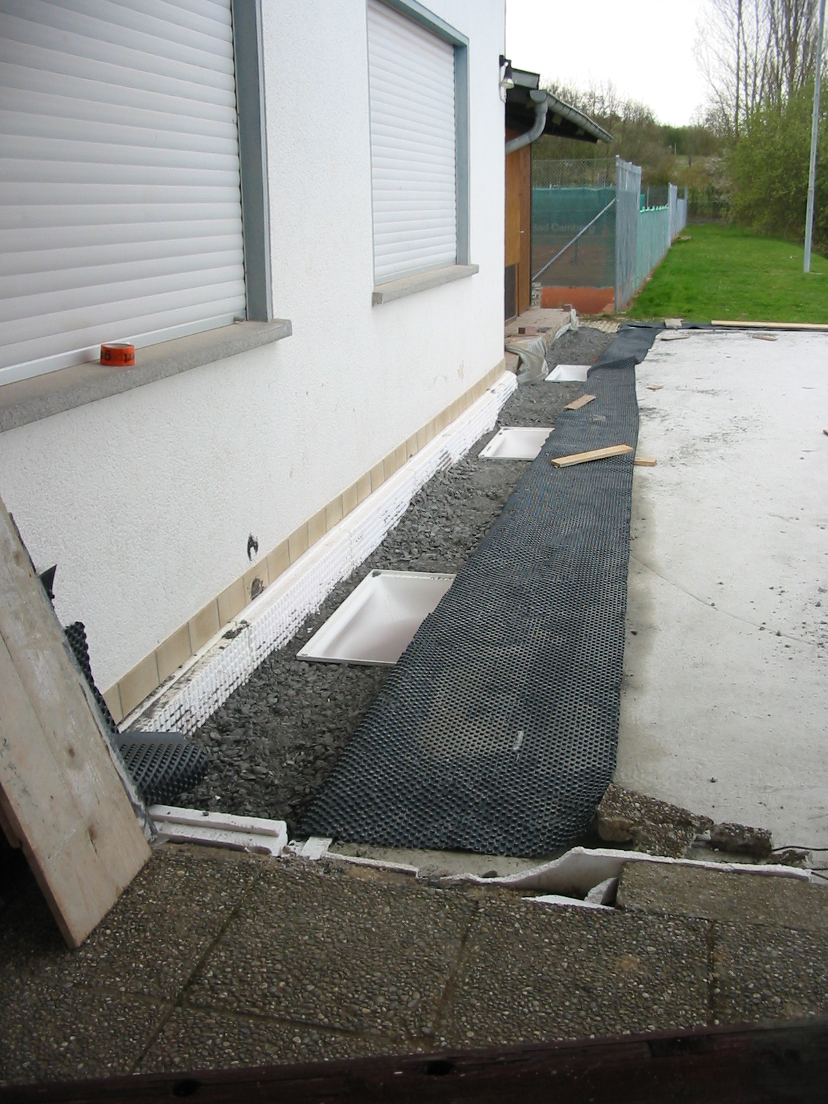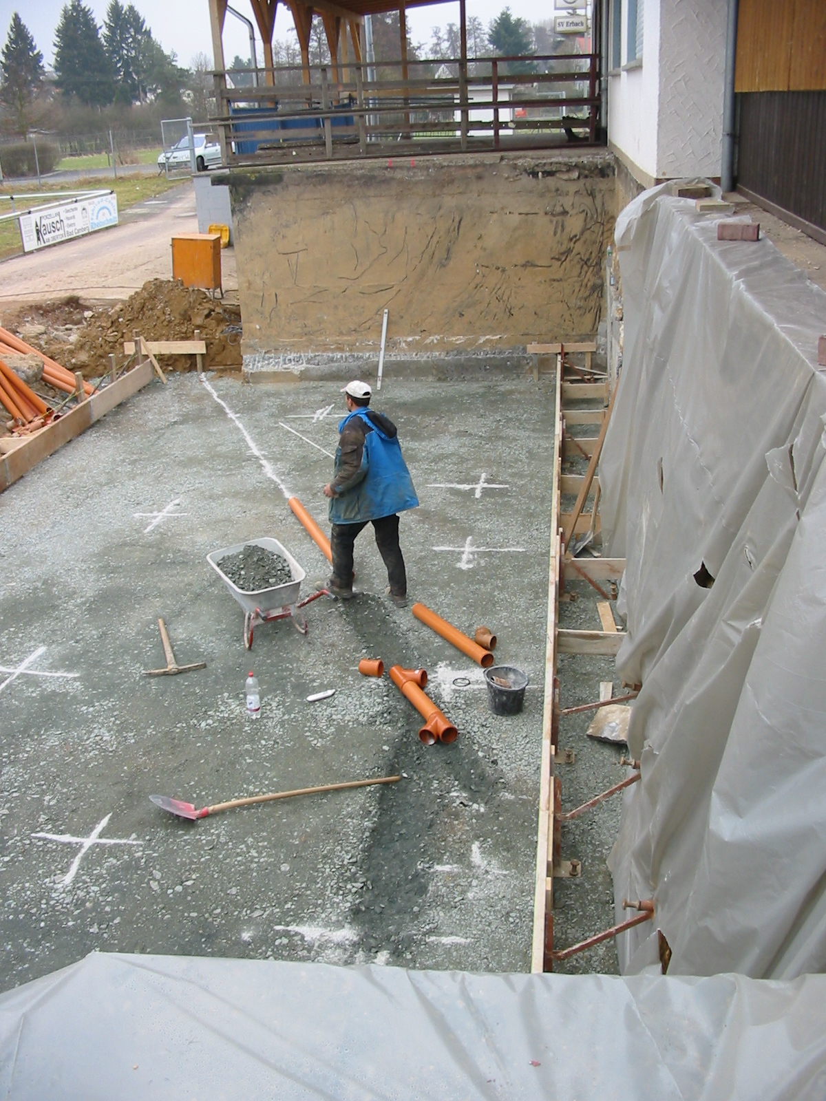 Danach begann der eigentliche Teil des Baus mit der Fertigstellung der Bodenplatte und dem Legen der Abflussrohre...